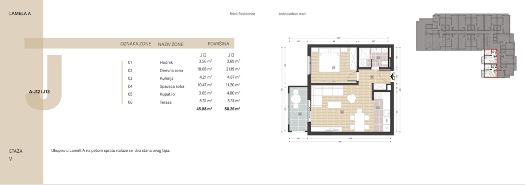 Apartment A-J13 V, with an area of 50.26m2, has been carefully designed to provide comfort and enjoyment in everyday life. It consists of a spacious living area, one bedroom, bathroom and terrace offering a sea view.