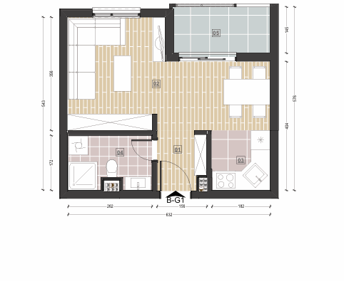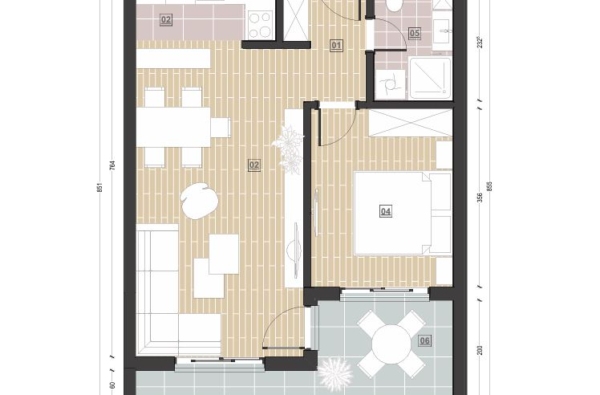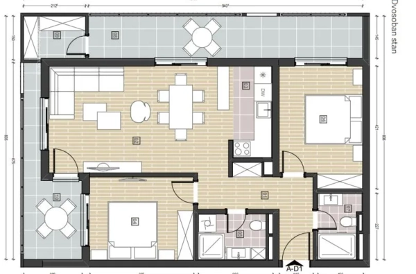 Stan A-D1, površine 88,10 m², pažljivo je projektovan kako bi pružio maksimalan komfor i uživanje u svakodnevnom životu. Sastoji se od prostrane dnevne zone, dvije spavaće sobe, dva kupatila i čak dvije terase sa kojih se pruža očaravajući pogled na more.
